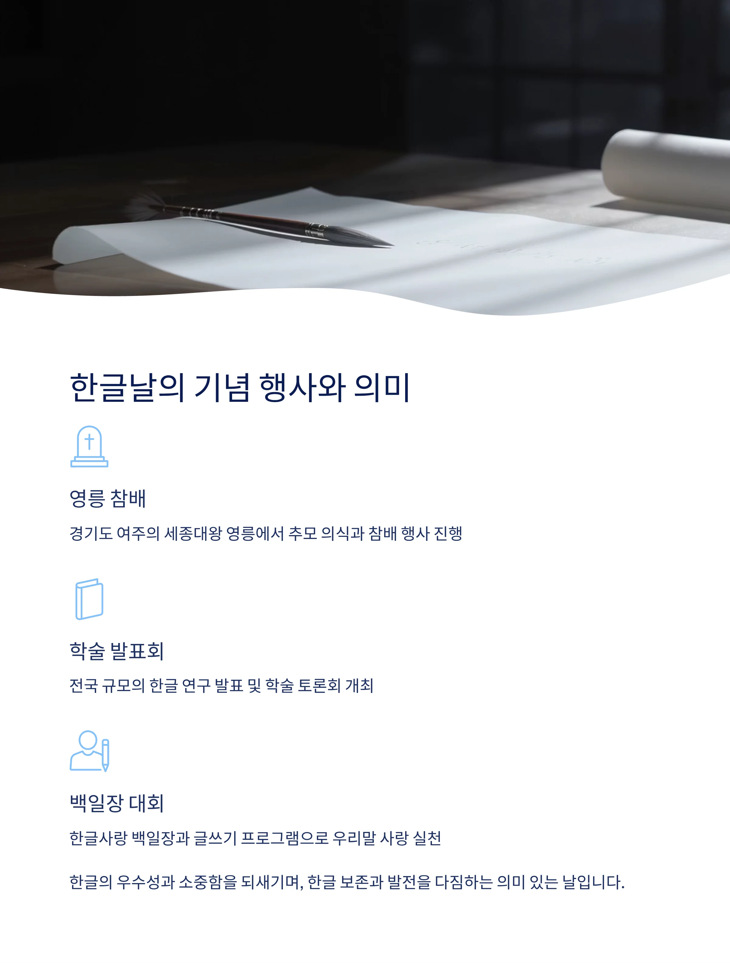 한글날에는 세종대왕의 업적을 기리기 위한 기념식과 모든 국민이 한글의 가치를 되새기는 다양한 행사가 펼쳐집니다.