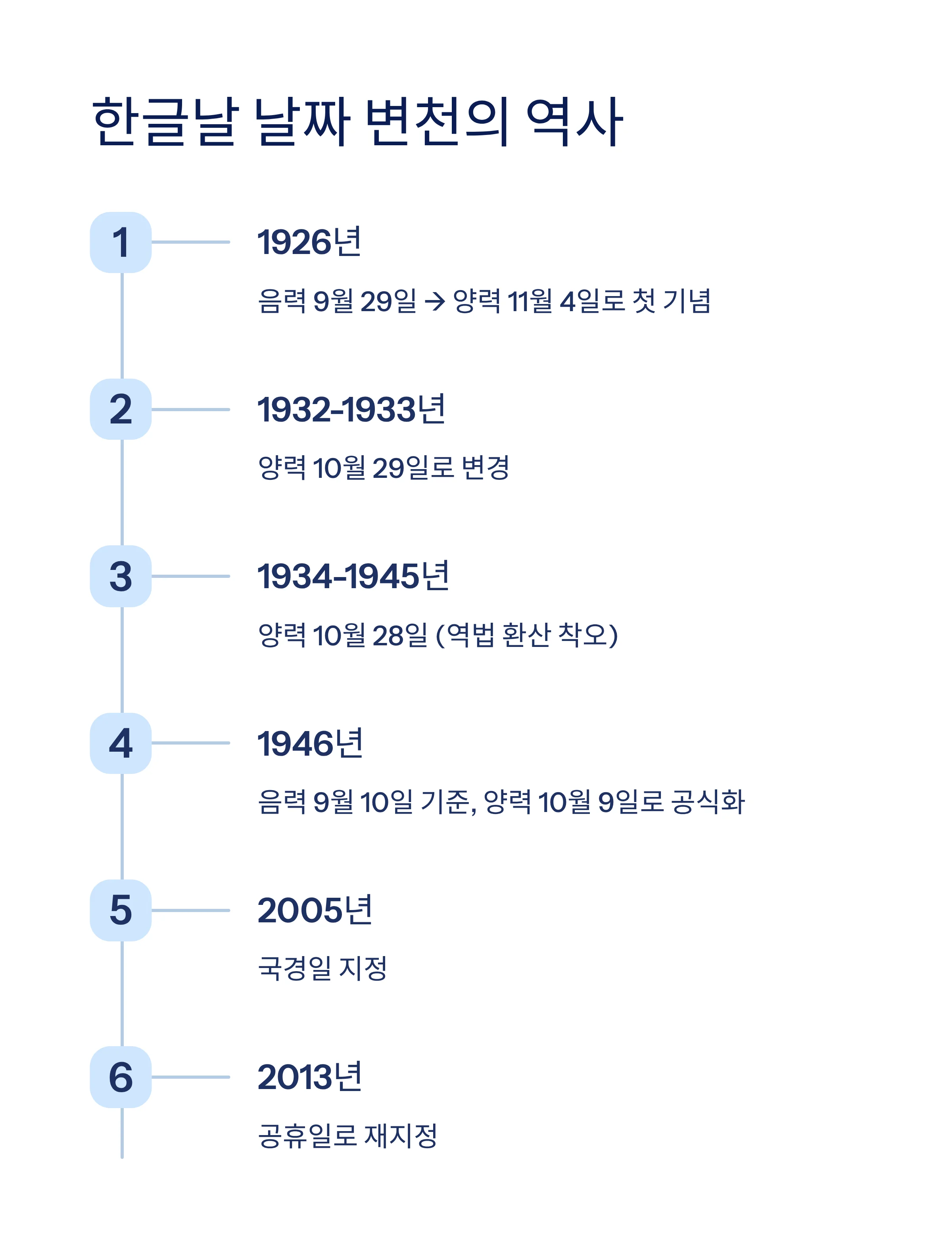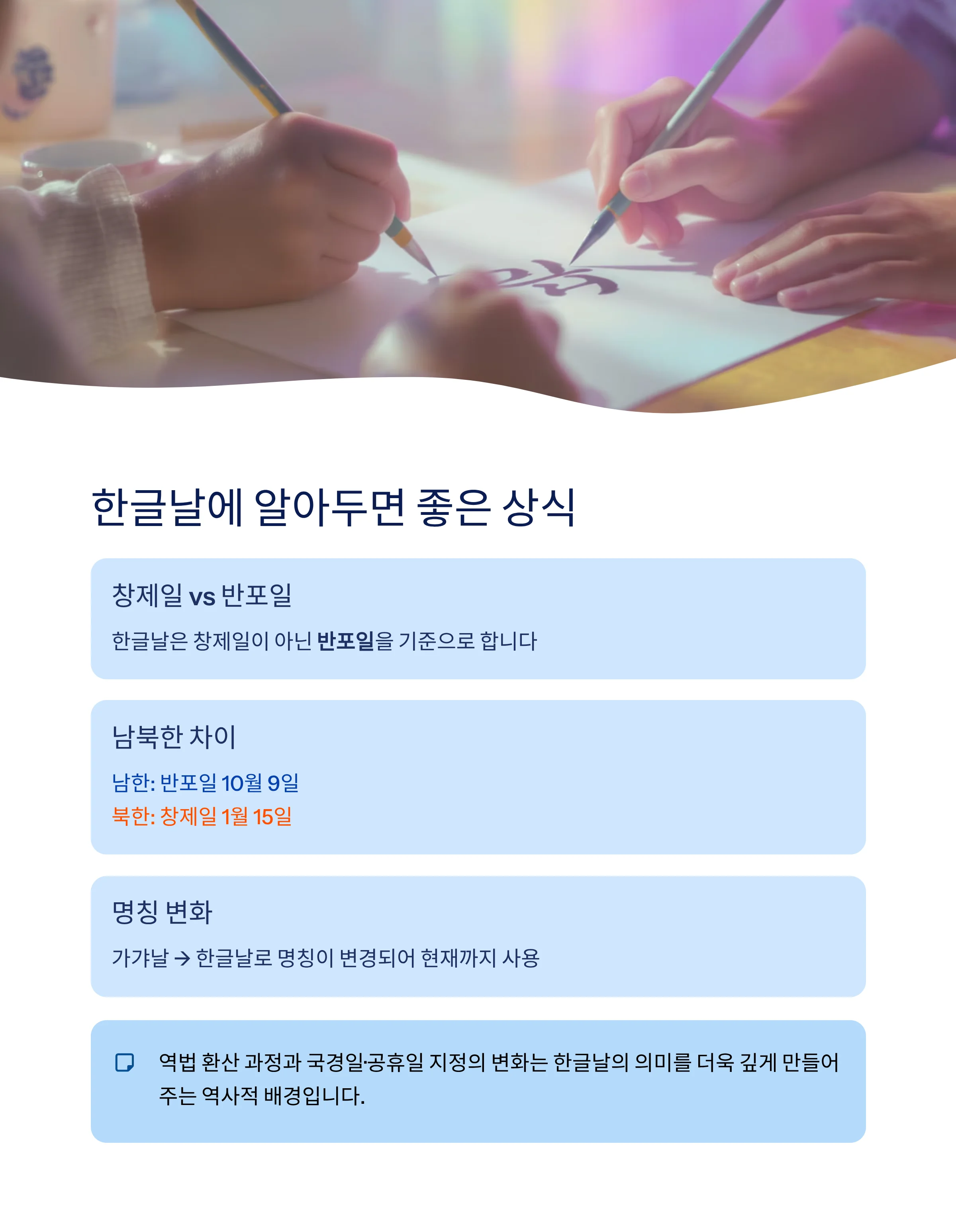 그 밖에도 한글날의 명칭 변화, 역법 환산 과정, 국경일 및 공휴일 지정을 둘러싼 변화 등은 한글날의 의미를 더욱 깊게 만들어주는 배경 요소입니다.