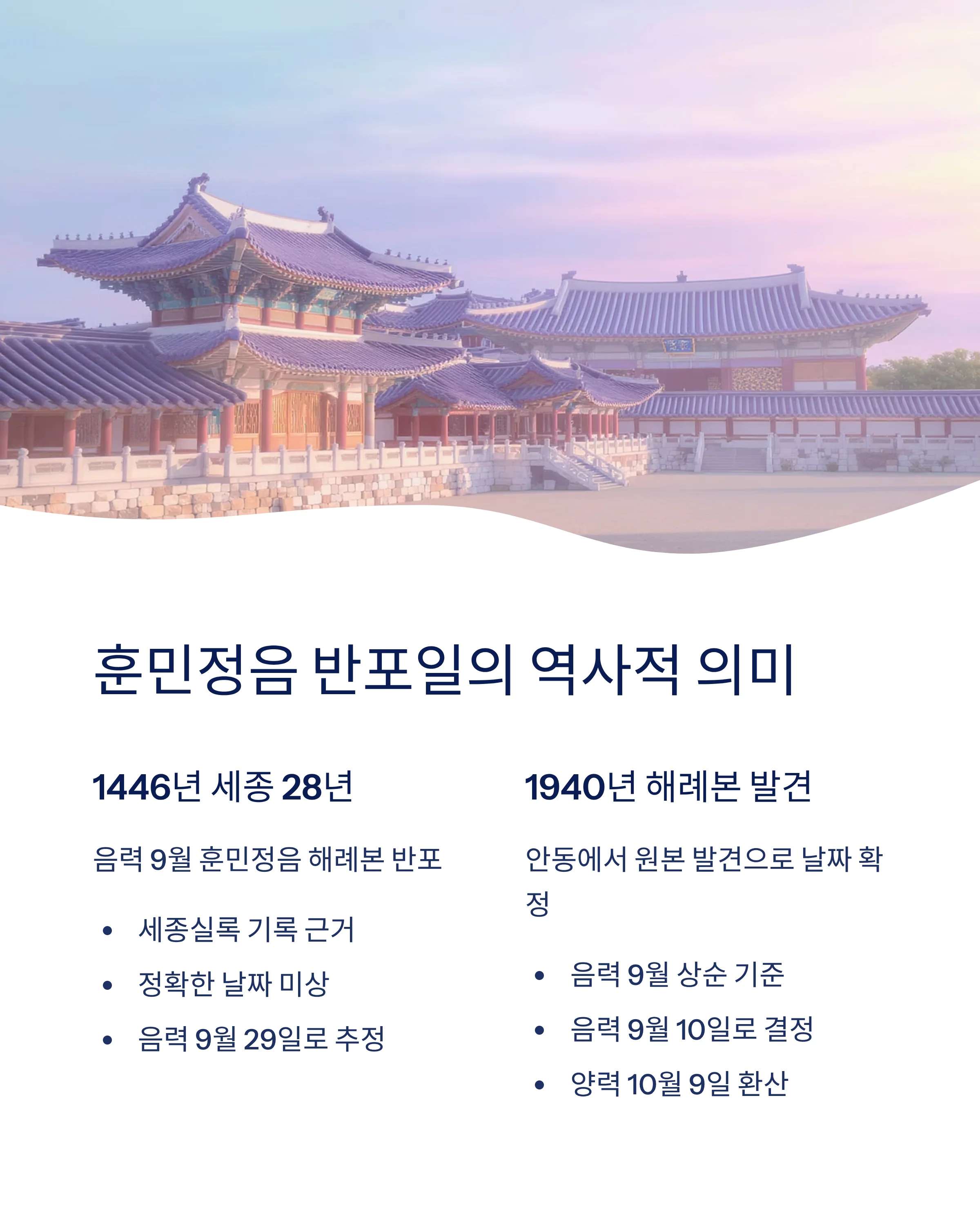 정확성을 위해 훈민정음 반포일로 추정된 음력 9월 10일을 기준으로 하였고, 1946년부터 이날을 양력 10월 9일로 공식화하여 국가 기념일로 자리 잡았습니다.