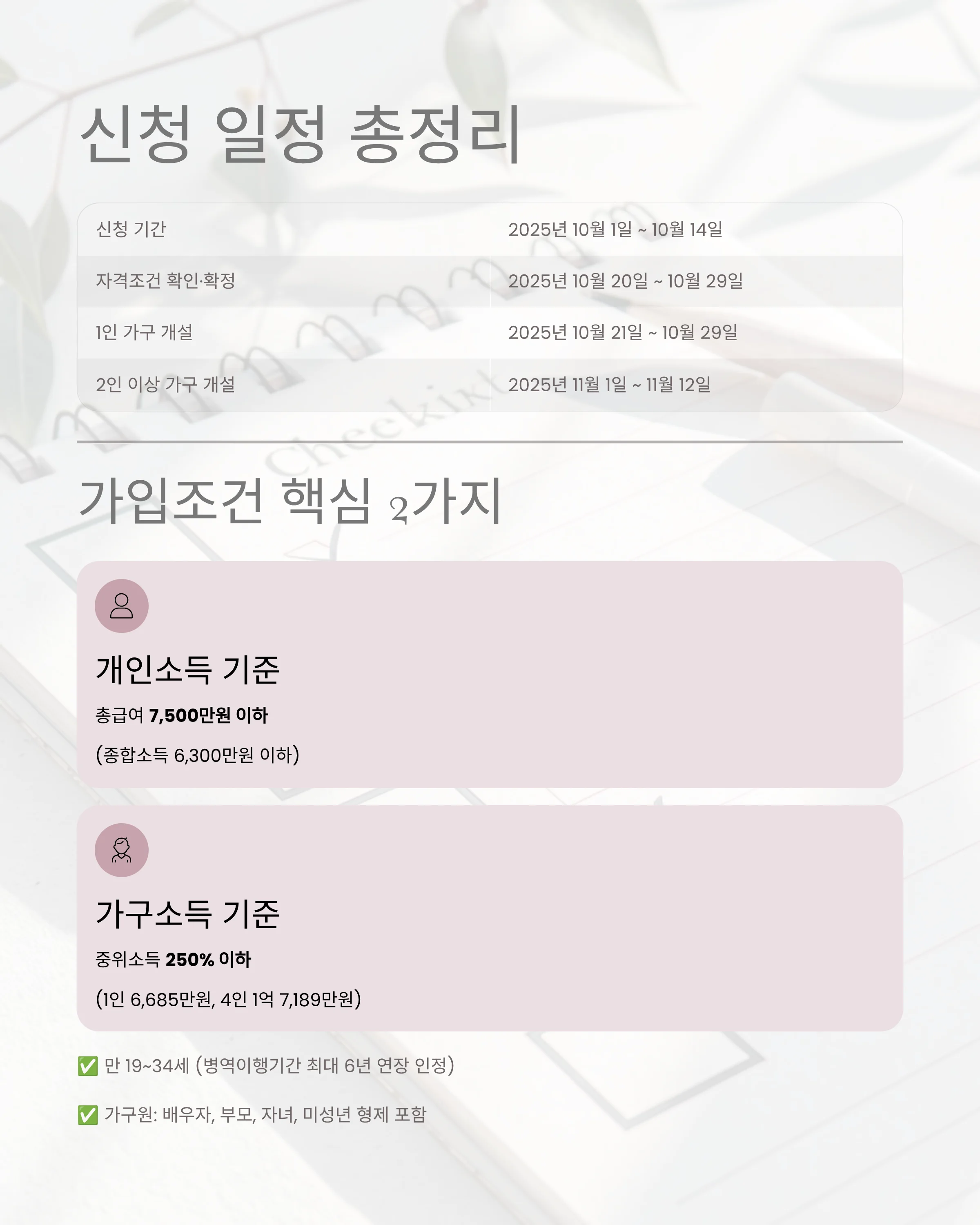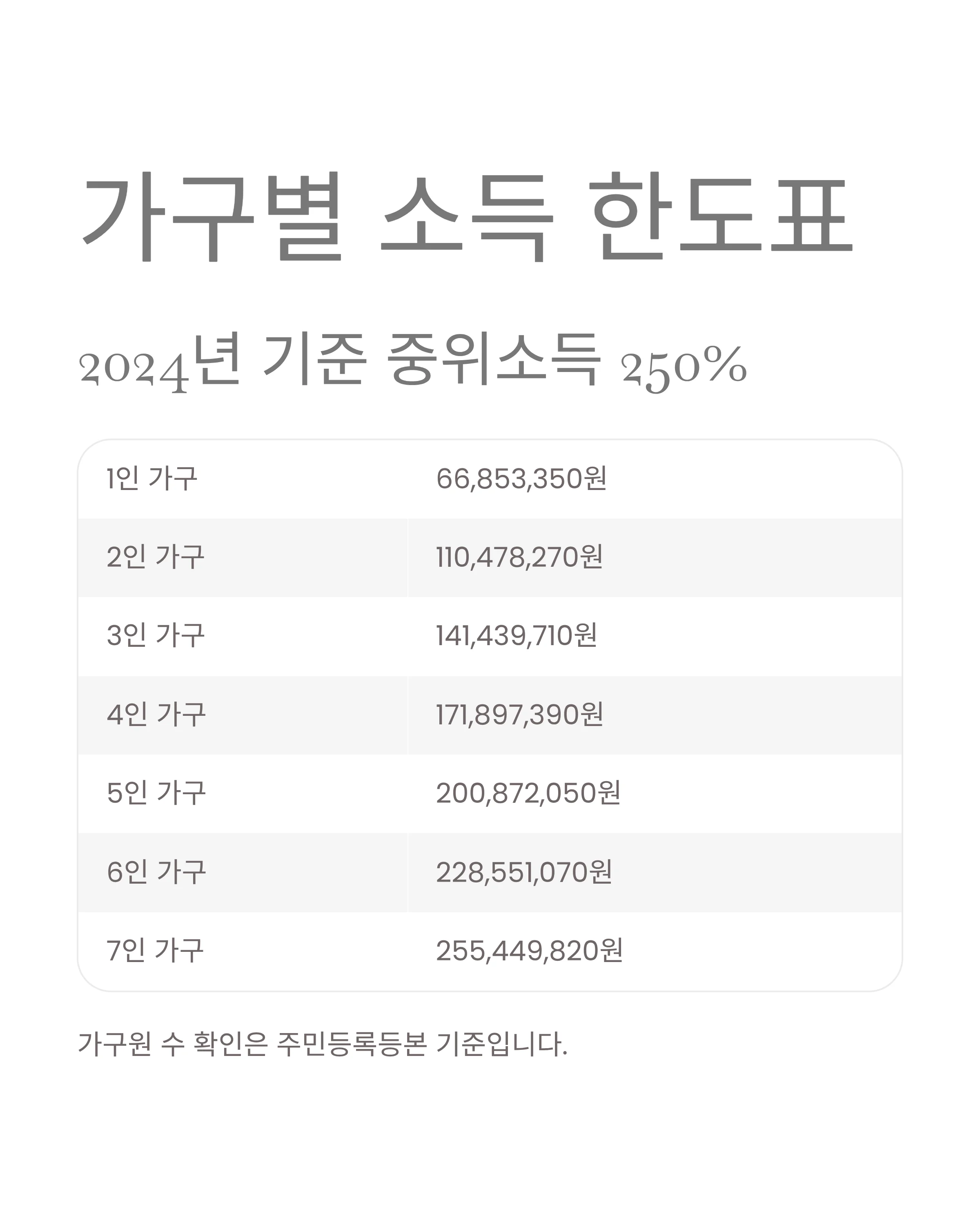 • 가구소득: 중위소득 250% 이하(1인 가구 6,685만 원, 4인 1억 7,189만 원, 7인 2억 5,544만 원/24년 기준)