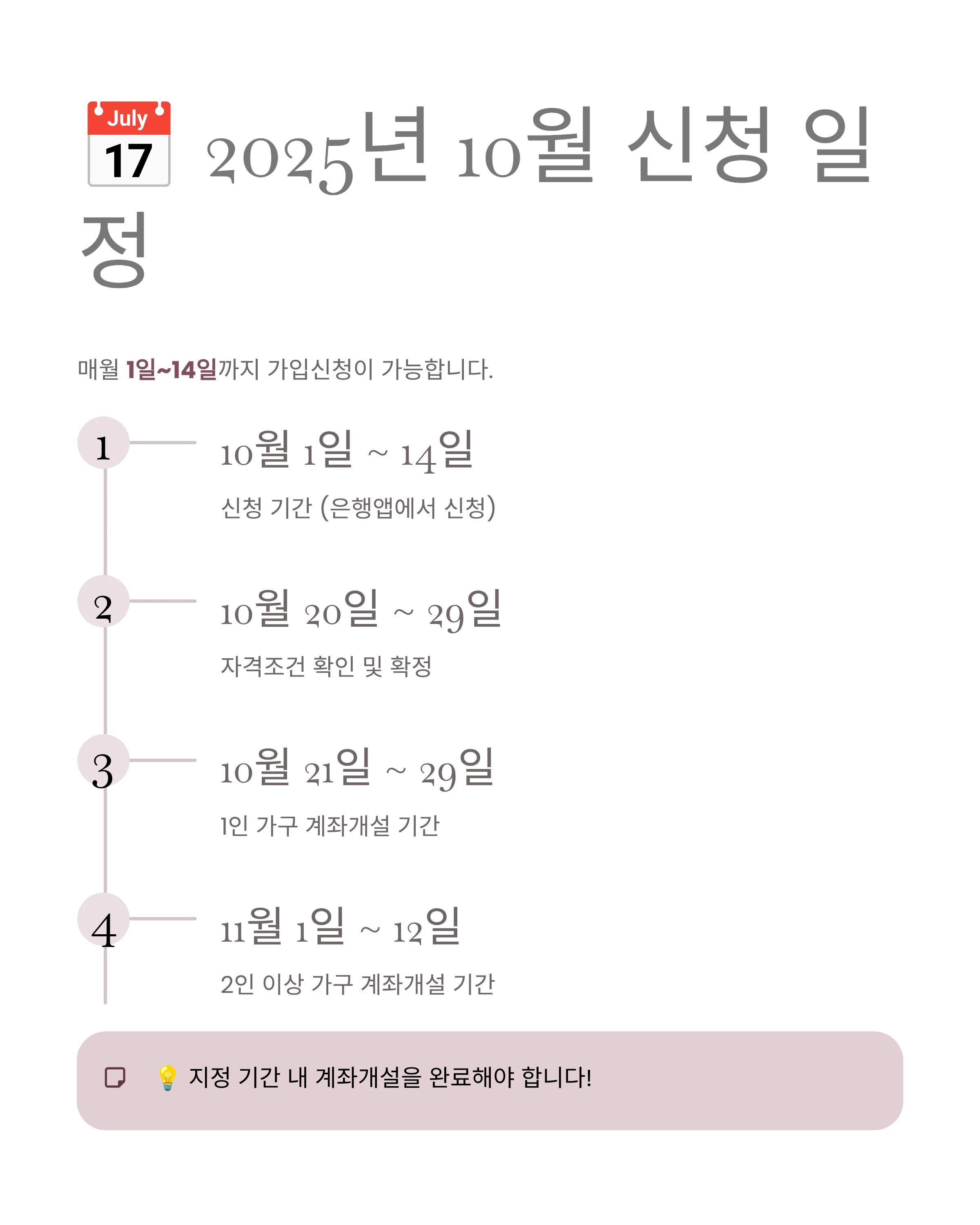 | 1인 가구 개설 | 2025년 10월 21일 ~ 10월 29일 |