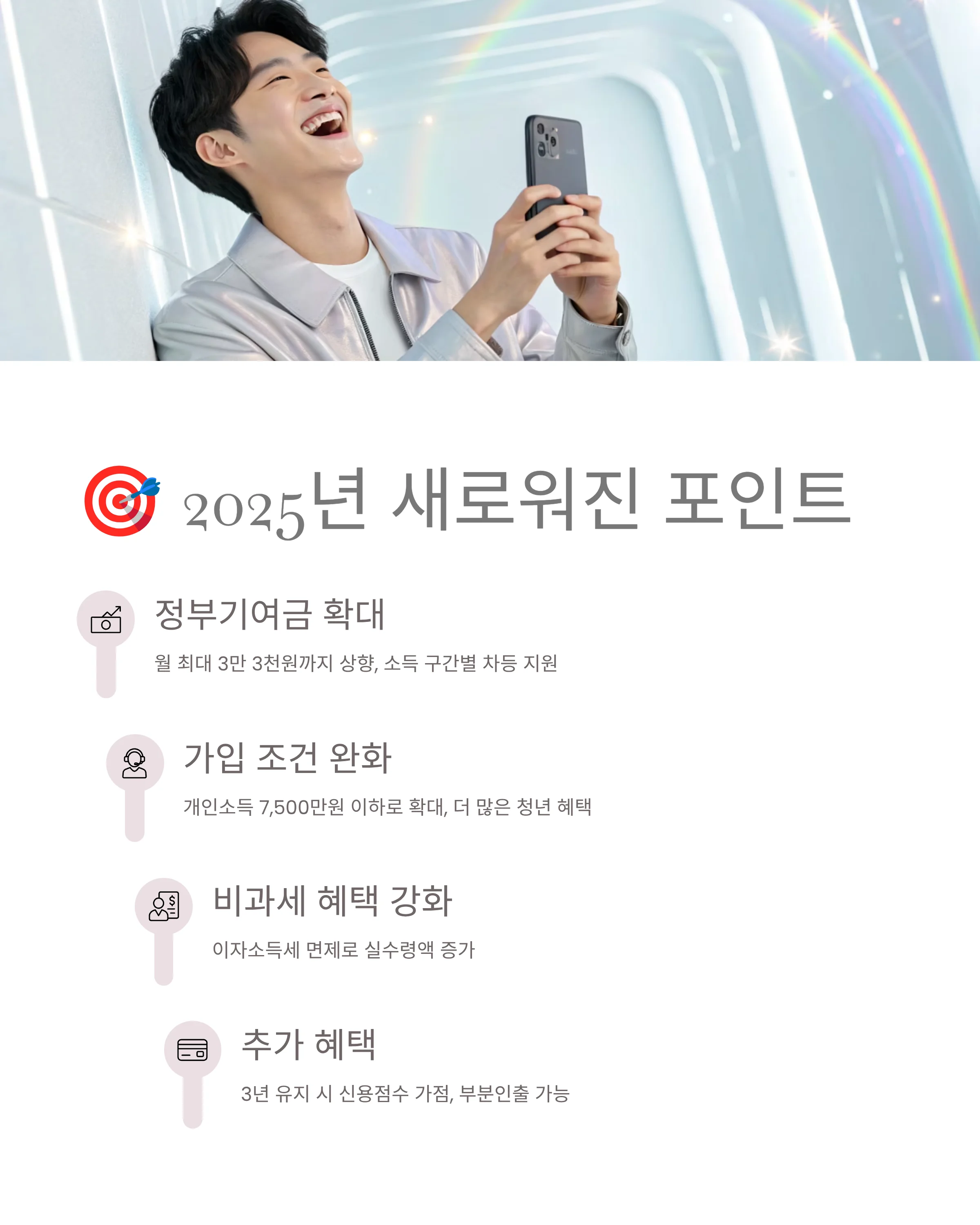 추가적으로, 저소득층은 우대금리가 제공되며 계좌 유지 3년 시점 이후에도 별도 비과세 및 신용점수 가점, 부분인출 서비스 등 실질 혜택이 강화됩니다.