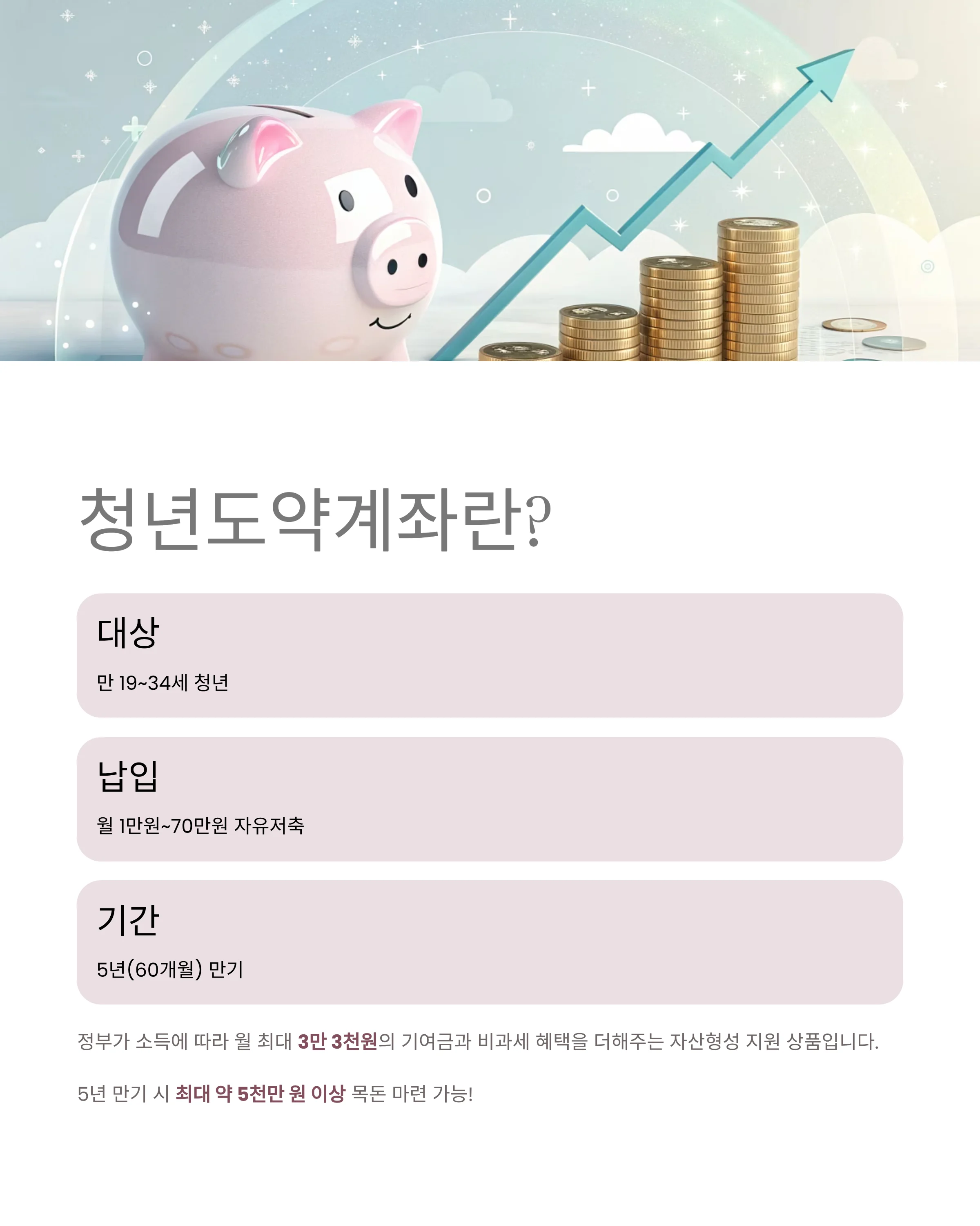 청년도약계좌는 만 19~34세 청년이 매달 자유롭게 저축(1만 원~70만 원)하면 정부가 소득에 따라 월 최대 3만 3천 원의 정부기여금과 비과세 혜택까지 더해주는 자산형성 지원 상품입니다.
