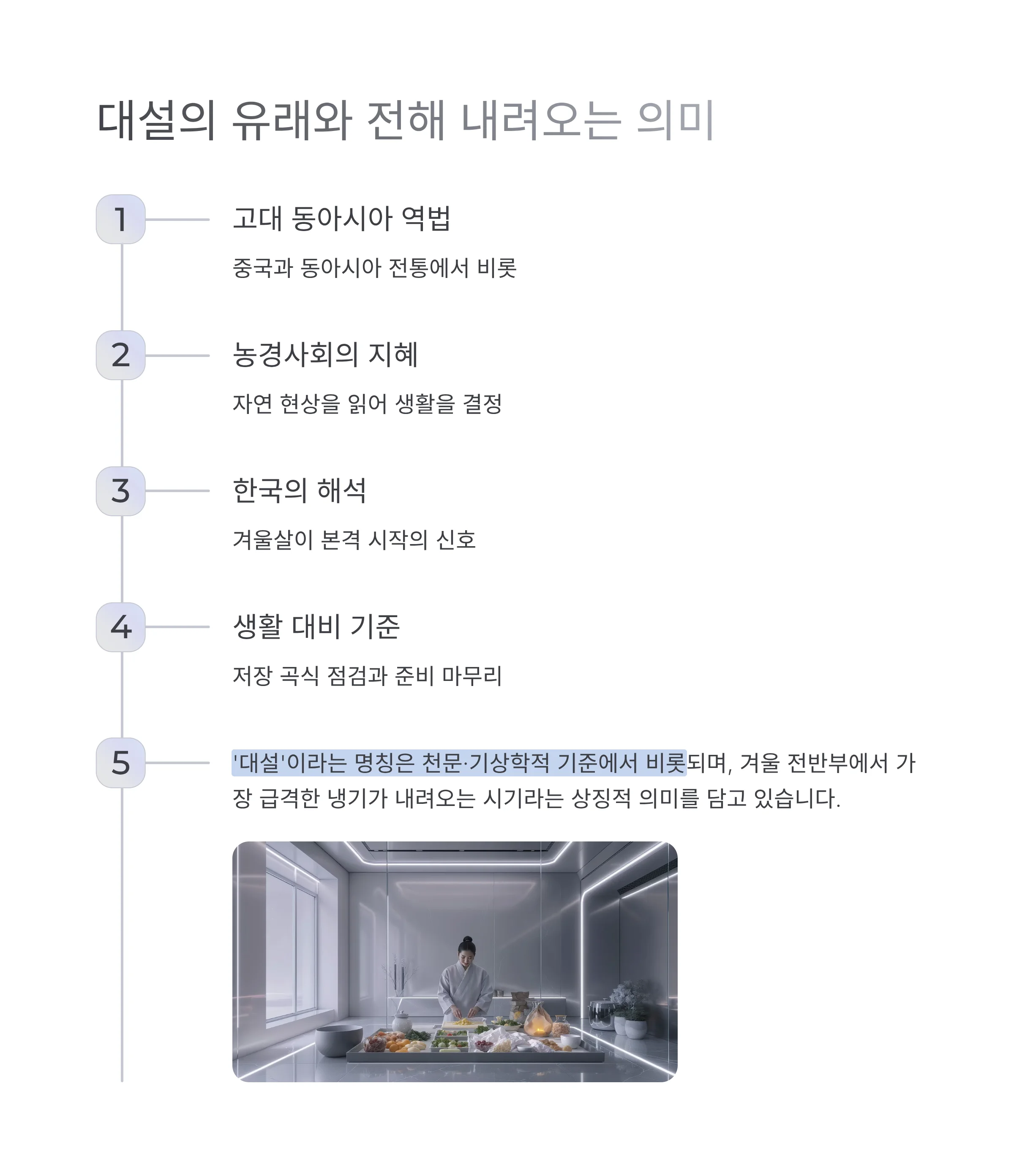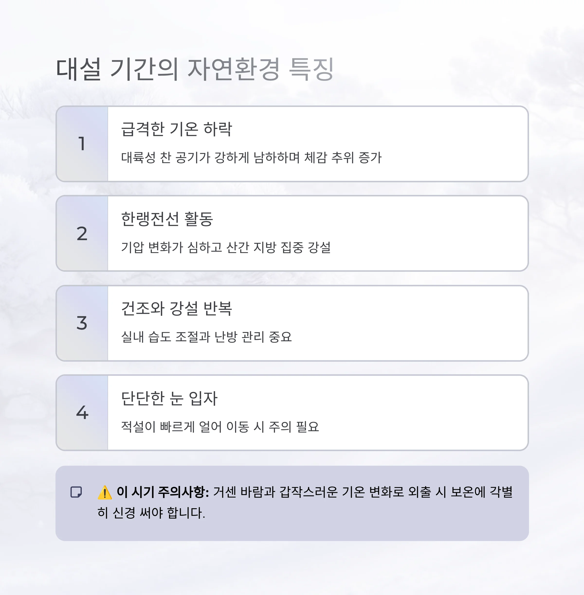 ‘대설’이라는 명칭은 천문‧기상학적 기준에서 비롯되며, 겨울 전반부에서 가장 급격한 냉기가 내려오는 시기라는 상징적 의미도 함께 담고 있습니다.