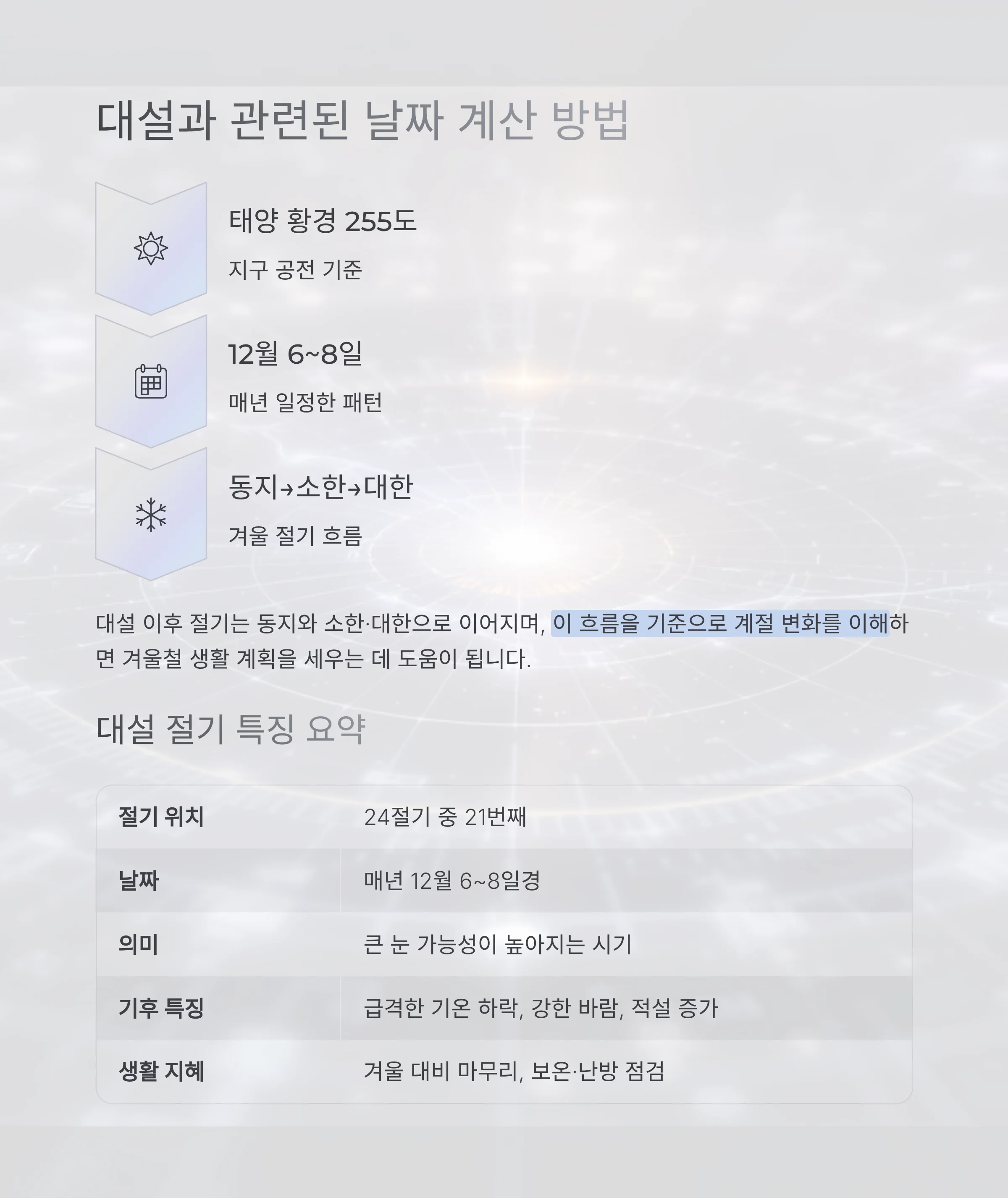 오늘날 달력에는 이미 계산된 대설 날짜가 표시되어 있지만, 전통적으로는 절기 계산식을 통해 직접 구하기도 했습니다. 대설 이후 겨울 절기는 동지와 소한·대한으로 이어지며, 이 흐름을 기준으로 계절 변화를 이해하면 겨울철 생활 계획을 세우는 데 도움이 됩니다.
